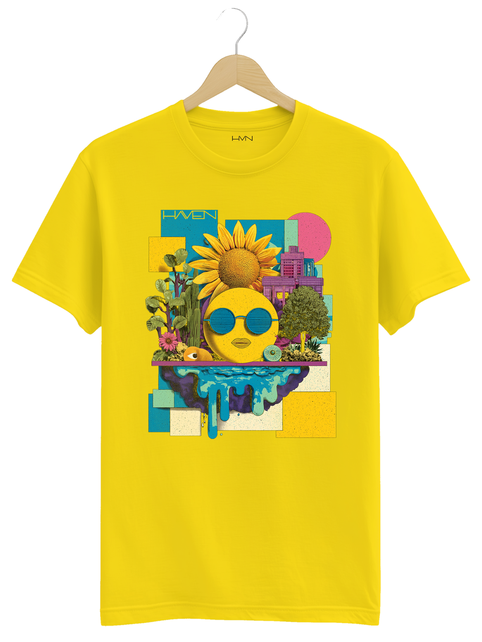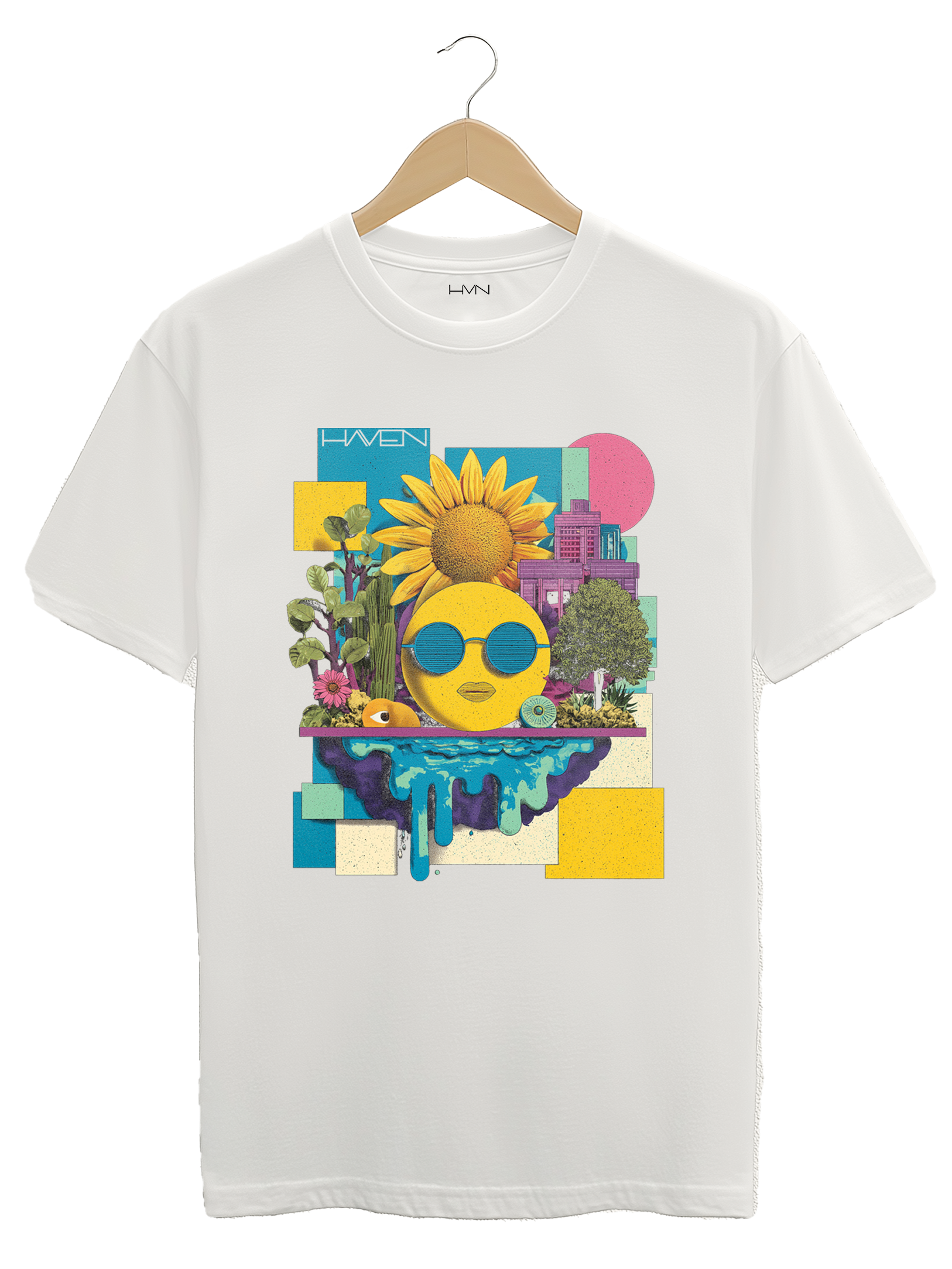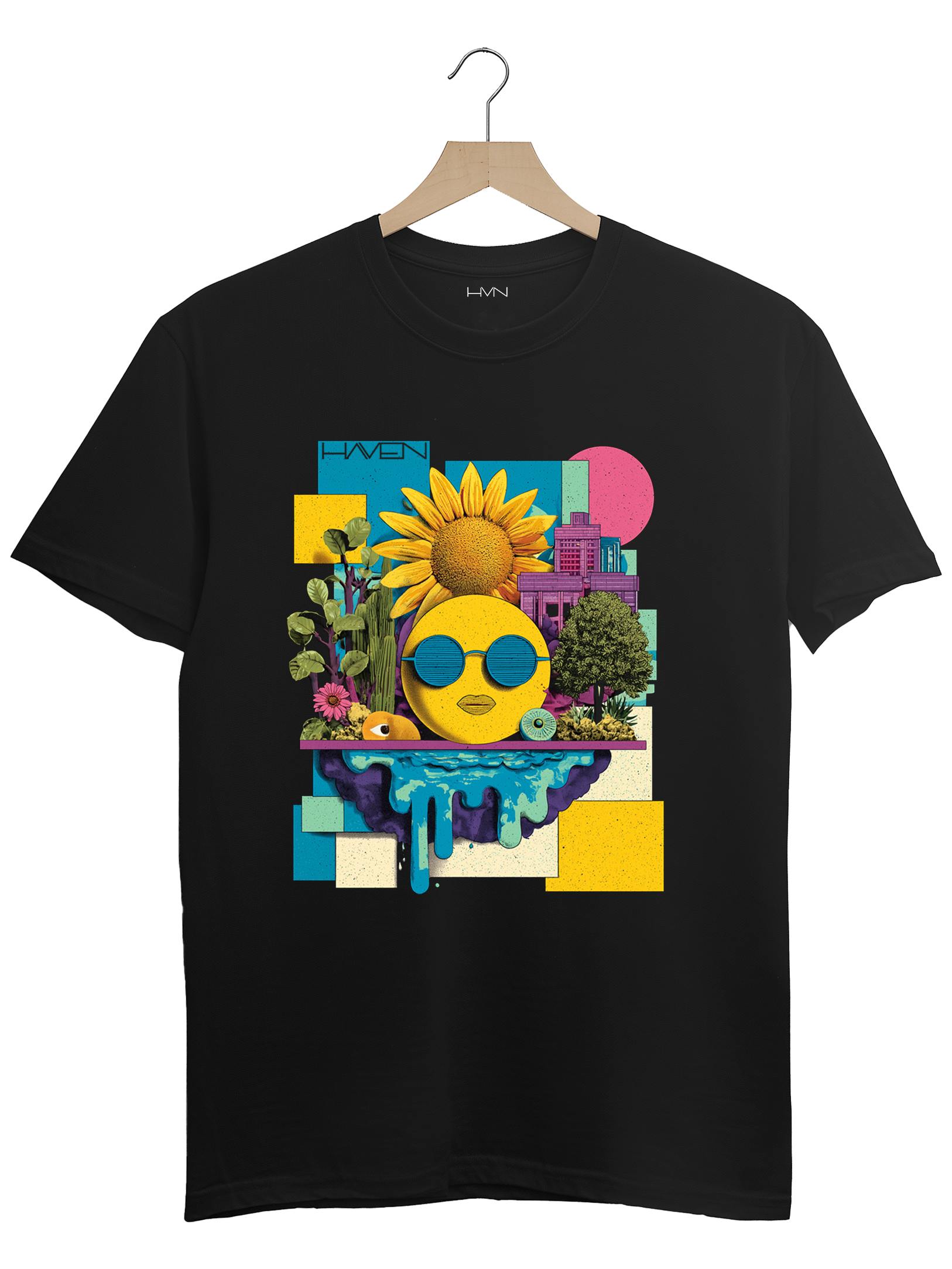 Where the sun wears shades and everything feels a little too good to last. This design captures that peak summer vibe, the heat, the bloom, the city, all dripping into a playful, surreal moment. It’s the season where the world melts into colour, and you just go with it.